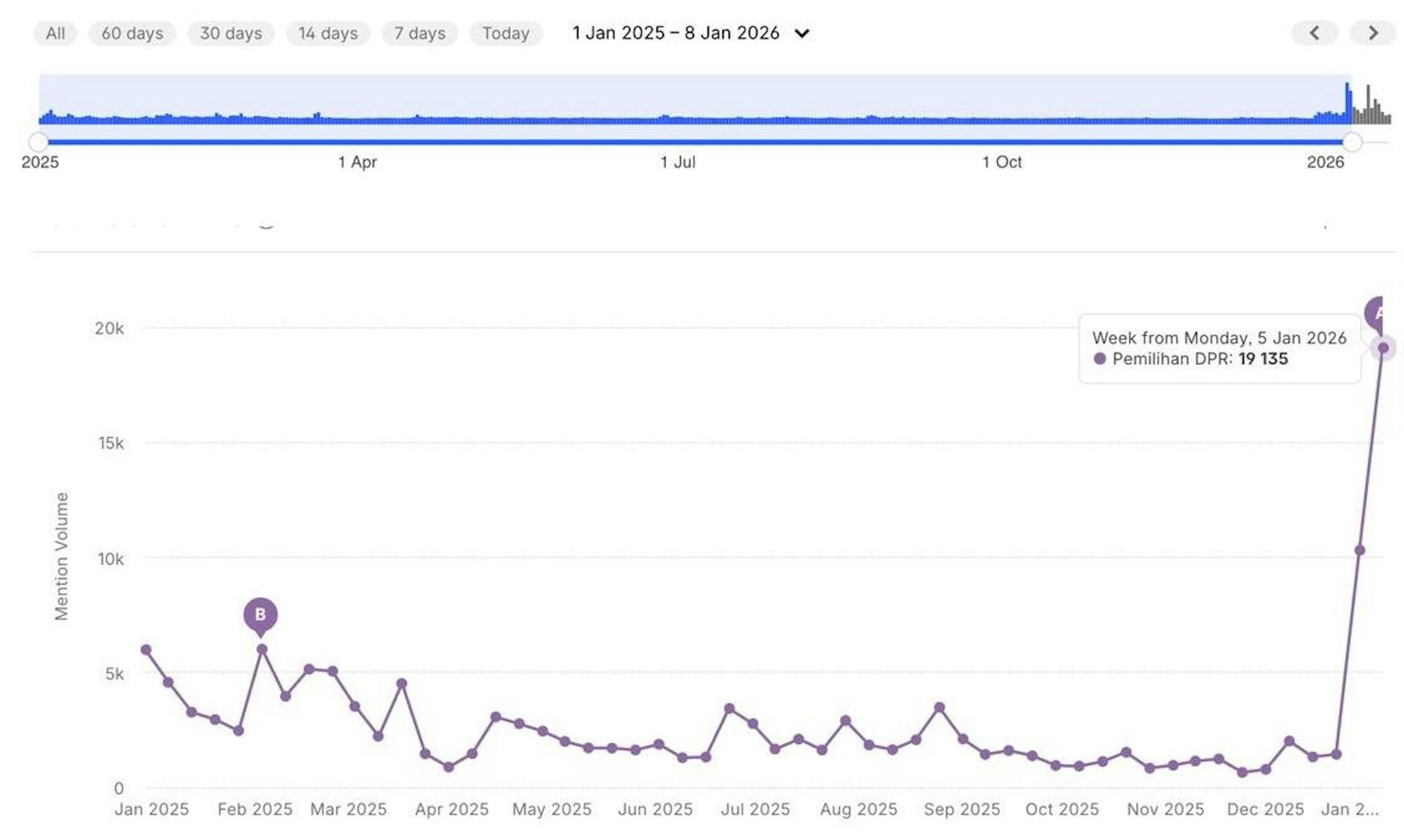 Data tersebut memotret tiga hal. Pertama, narasi pilkada oleh DPRD ternyata eksis di X sepanjang tahun 2025. Namun, jumlah unggahannya melonjak sejak Desember 2025 selepas pidato Prabowo dan Ketua Umum Partai Golkar Bahlil Lahadalia pada 6 Desember, dan terus naik hingga 5 Januari 2026 dengan total 19.135 unggahan.