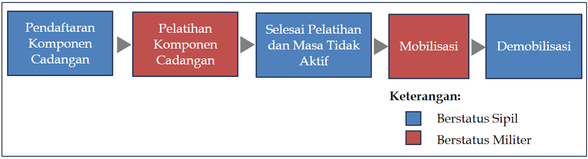 Bedanya, anggota komponen cadangan adalah prajurit paruh waktu[12]. Mereka hanya akan berstatus militer ketika mendapatkan pelatihan dan misi mobilisasi. Selebihnya, anggota Komponen Cadangan akan berstatus sipil.