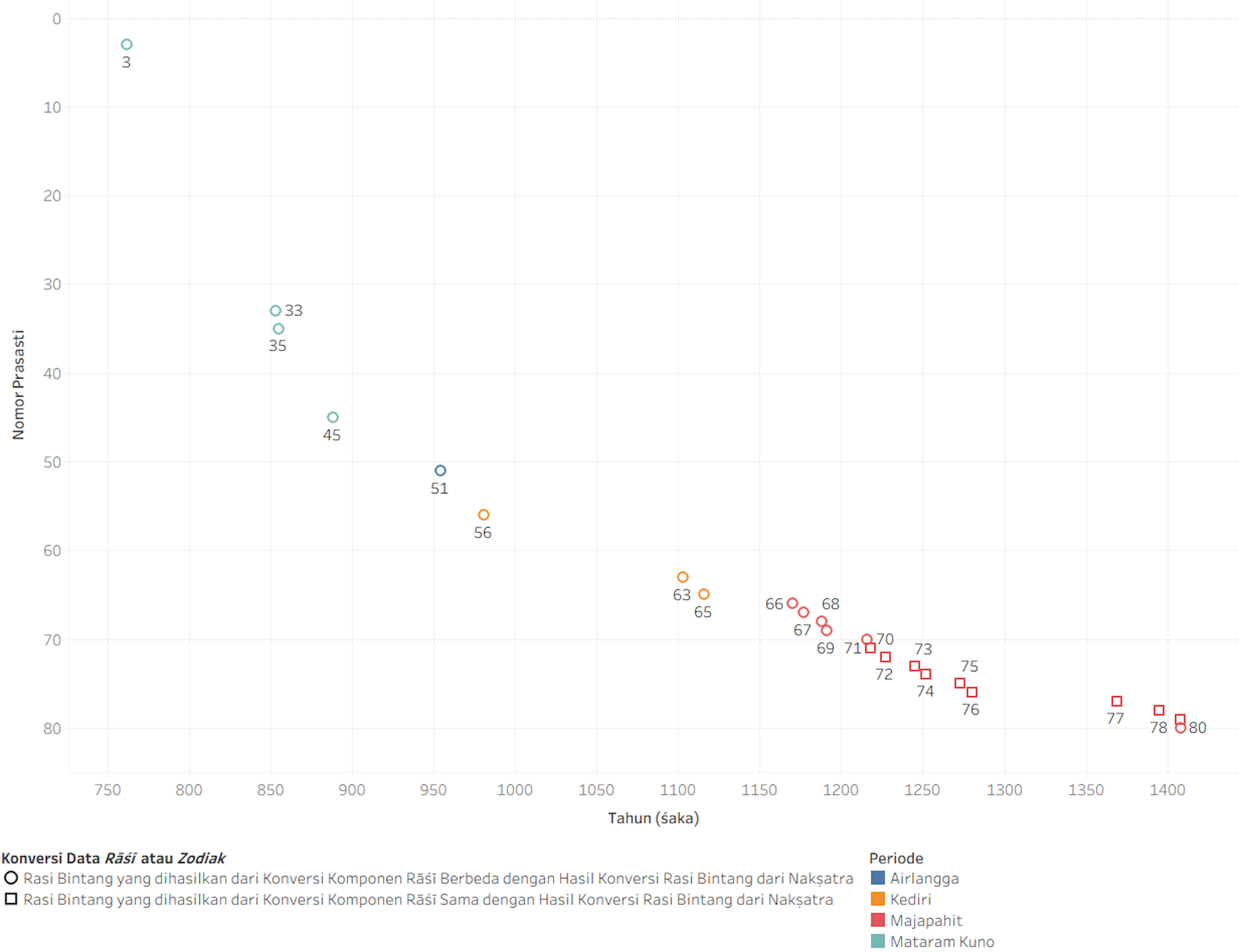 Gambar 4. Hasil Analisis Komponen Rāśi pada 80 Prasasti Jawa Kuno di Indonesia. Simbol lingkaran yang muncul pada gambar ini menunjukkan bahwa komponen rāśi pada prasasti Jawa Kuno sebelum memasuki tahun 1200-an Masehi, memiliki perbedaan terhadap komponen nakṣatra, yang menunjukkan bahwa kesesuaian (keakuratan) penentuan komponen rāśi dan nakṣatra baru terjadi setelah memasuki tahun 1200-an Masehi (ditandai dengan nomor prasasti: 70)