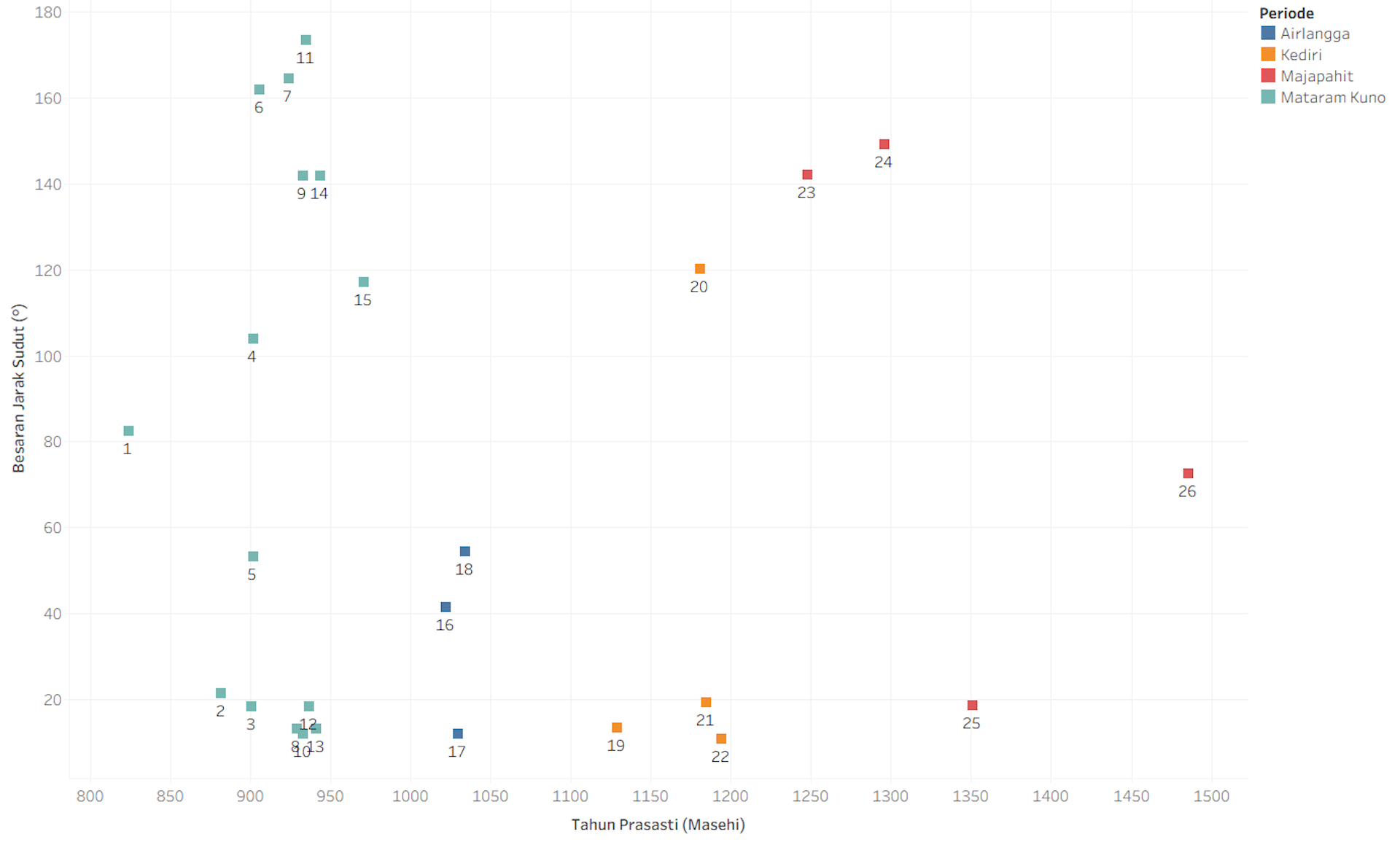 Gambar 5. Hasil Analisis 26 Komponen Nakṣatra dari 80 Prasasti Jawa Kuno di Indonesia. Analisis tersebut (simbol persegi) menunjukkan bahwa, frekuensi kemunculan paling banyak terjadi pada periode Mataram Kuno, yang berangsur mengalami penurunan hingga periode Majapahit. Perbandingan persentase dengan jumlah sampel prasasti Jawa Kuno yang digunakan, menunjukkan bahwa wariga baru mengalami peningkatan keakuratan pada masa Majapahit.