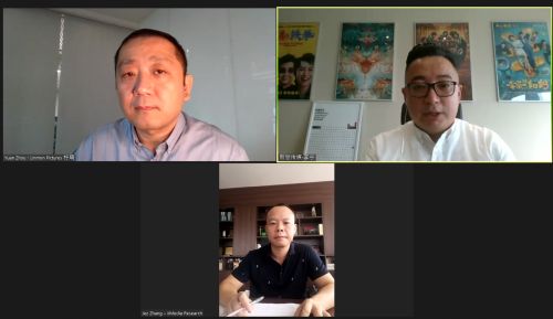 | A seminar titled "Rise Above & Go Beyond: China Entertainment Forecast" was held at FILMART Online earlier today. Jez Zhang, CEO and Chief Analyst of iiMedia Research Group (bottom), James Li, SVP of New Classics Media Group and CEO of New Classics Media Pictures (upper R), and Yuan Zhou, EVP of Linmon Pictures (upper L), discussed the post-pandemic development of Mainland China's entertainment market as well as the integration of online and offline business models in the industry. |