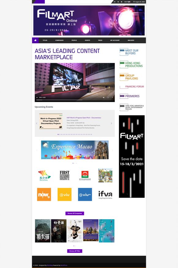 FILMART OnlineDate: 26-29 August 2020Website: http://www.hktdc.com/hkfilmartSchedule of seminars and special events: https://tinyurl.com/y35e6psv