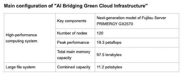 1. Large-Scale Cloud Platform for AI Applications with 120 Latest Servers Fujitsu will deliver 120 of its next generation Fujitsu PRIMERGY GX2570 servers fueled by two 3rd Gen Intel Xeon Scalable processors (codenamed Ice Lake) with Intel DL Boost per node and accelerated by eight NVIDIA A100 high-end GPUs. Fujitsu anticipates that the system will provide a theoretical peak performance of half-precision floating-point operations of 850 petaflops, and that of double-precision floating-point operations is expected to be 56.7 petaflops, with the combined computing capacity of "ABCI" and the "AI Bridging Green Cloud Infrastructure" system. This level of performance is equivalent to second place in Japan and sixth place in the world according to the latest TOP 500 supercomputer ranking announced in June 2020.
