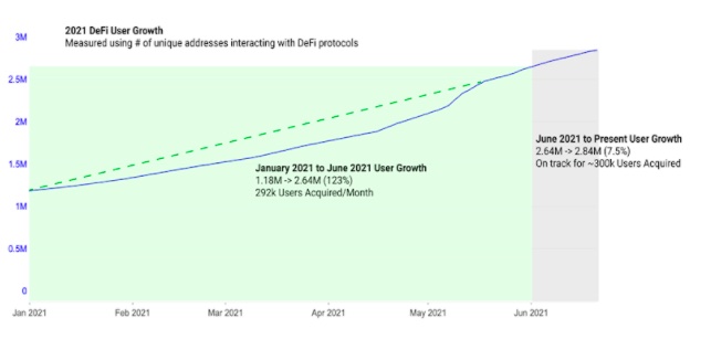 To ascertain if the few DeFi-blockchains are likely overvalued or undervalued, let us examine the DeFi adoption in the past year. DeFi adoption has been taking off in a gradual way since the early part of 2021, as can be seen in the below chart. The month-on-month growth of DeFi users had been consistent, with 292,000 new users registered every month since Jan 2021. In June, despite the market fallout, the number of new DeFi users did not drop, in fact that number actually went up to 300,000. This suggests that growth in DeFi adoption has not only not receded, but it actually picked up pace, which shows an aggressive growth trajectory. Valuation in an industry which is growing aggressively should have a premium, which means they ought to command premium valuation. Hence, this in no way suggests that a lower valuation estimate should be warranted for blockchains doing DeFi. In this regard, ETH is not overvalued. ETH is in fact, rather undervalued, since ETH is now also on track with some major upgrades as imminent as July.