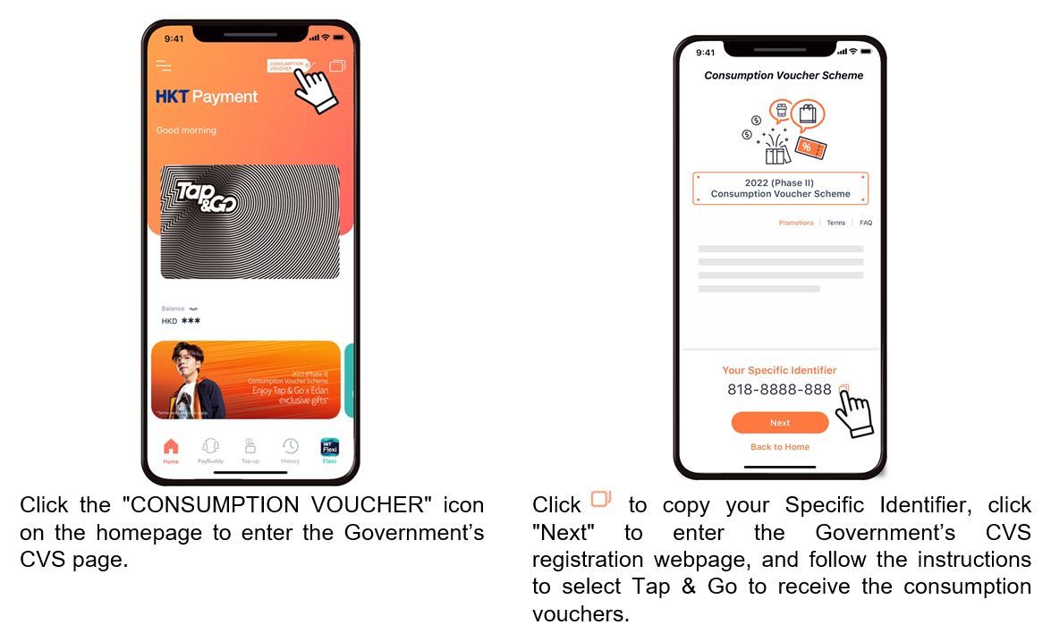 Existing Tap & Go consumption voucher users will not need to re-register to receive the 2022 (Phase II) consumption vouchers with Tap & Go. New users can register in two easy steps: download and log in to the Tap & Go mobile wallet, and click the "CONSUMPTION VOUCHER" icon. They can then copy the Specific Identifier and follow the instructions to enter the Government's CVS registration webpage and complete the application.