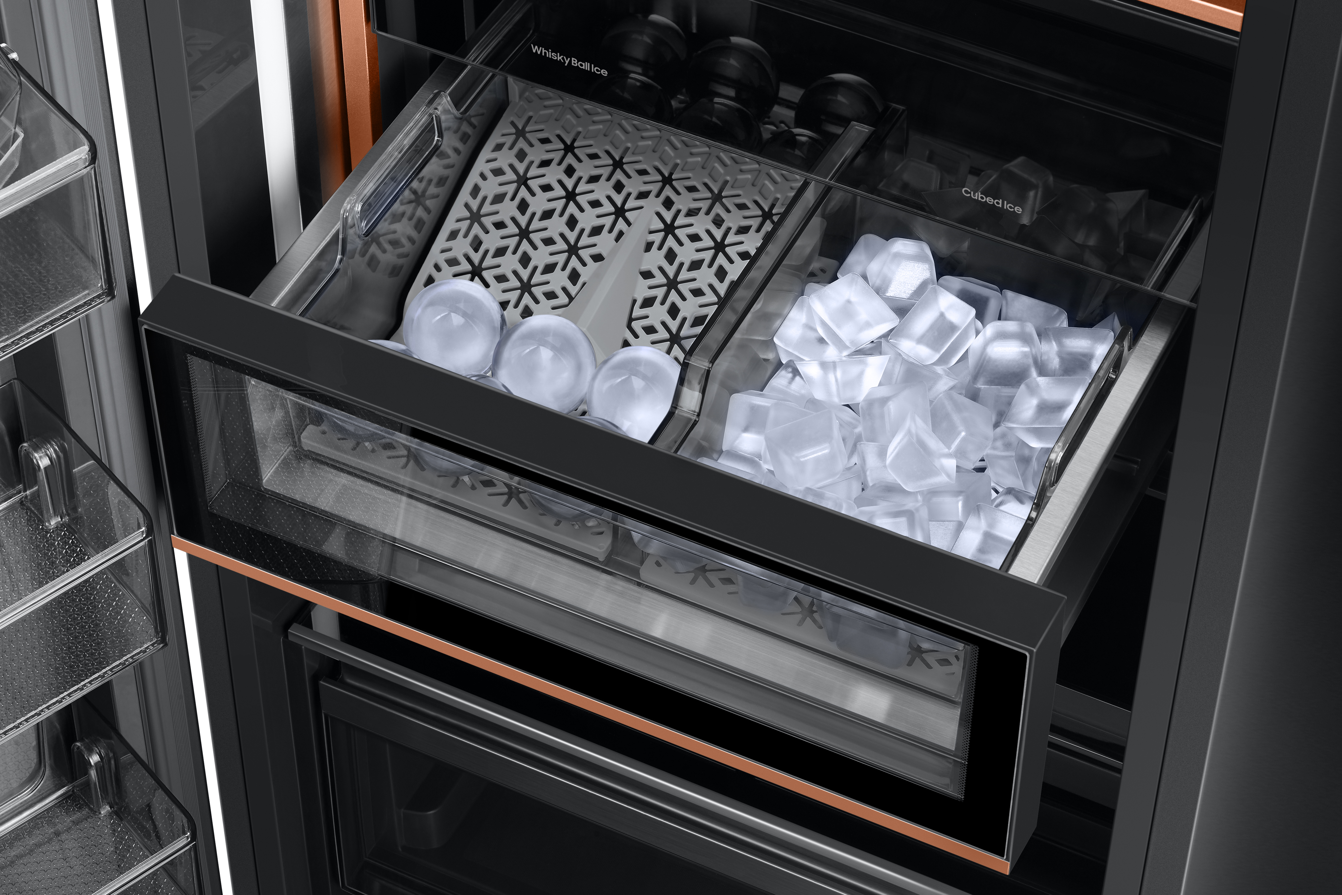 The Dual Auto Ice Maker in the 1-Door Freezer will ensure that users always have plenty of ice by automatically creating Whisky Ball Ice or Cubed Ice.