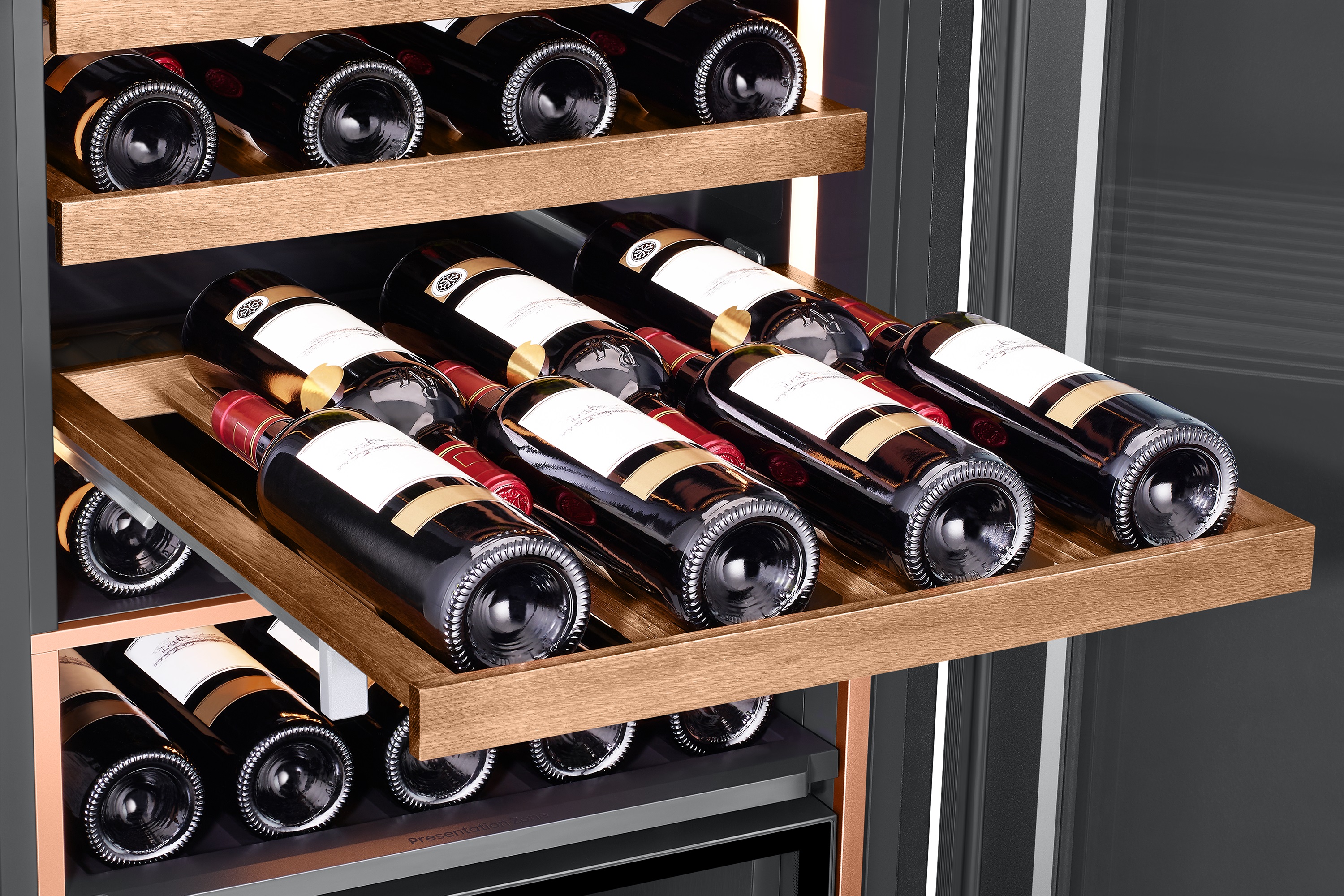 The Bespoke Infinite Line Wine Cellar consists of Triple Temperature Zone with three separate temperature-controlled compartments that create an optimal condition to simultaneously store different types of wine.
