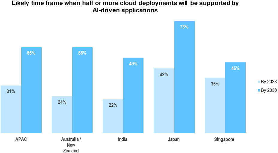 In APAC, 56% of tech executives report that half or more of their cloud deployments will be supported by AI-driven applications by 2030. This presents a long-term growth opportunity for AI-driven applications in the region.