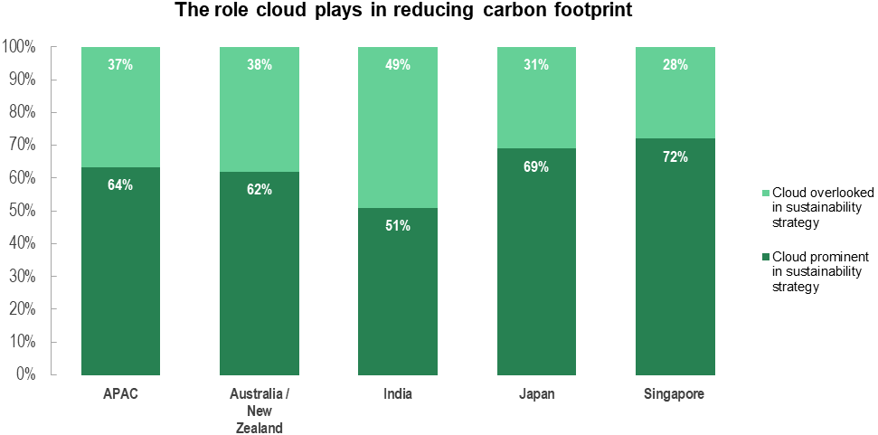 Furthermore, 80% of executives in APAC say cloud systems are developed with sustainability goals specifically in mind. Within the region, Singapore (72%) and Japan (69%) lead in featuring cloud prominently in their sustainability strategy.
