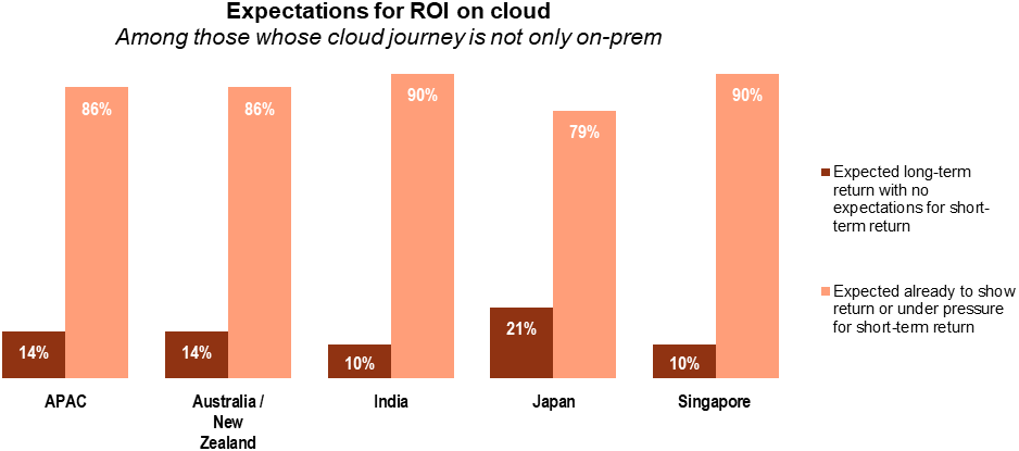 In APAC, 86% of tech executives are already expected to show a ROI on what the company has spent on cloud, either in increased revenue or in saved costs or are under pressure to show short-term progress. The pressure to already show ROI on cloud investment is highest in India and Singapore, where 9 out of 10 tech executives feel it.