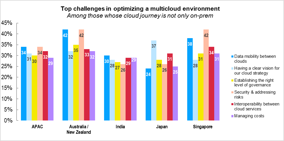 In APAC, tech executives in Australia/NZ cited data mobility (42%) and security and addressing risk (42%) as top challenges. Security and addressing risks also (42%) emerged as the top barrier in Singapore. In Japan, executives cited not having a vision for cloud strategy (37%) as the top barrier.