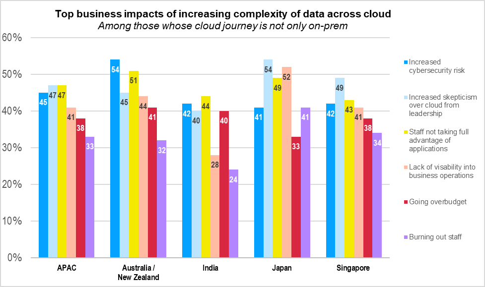 In Asia Pacific (APAC), the top business impacts due to increasing complexity of data across their cloud environments are increased skepticism over cloud from leadership (47%), staff not taking full advantage of business applications (47%), increased cybersecurity risk (45%), and lack of visibility into business operations (41%).