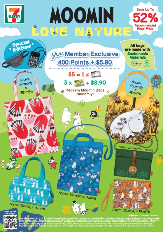 • Earn a stamp with every $5 spent at 7-Eleven; collect 3 stamps and top up $8.90 in cash to redeem a blind box of a trendy and utilitarian Moomin featured bag with 7-Eleven's Shop and Earn stamps programme